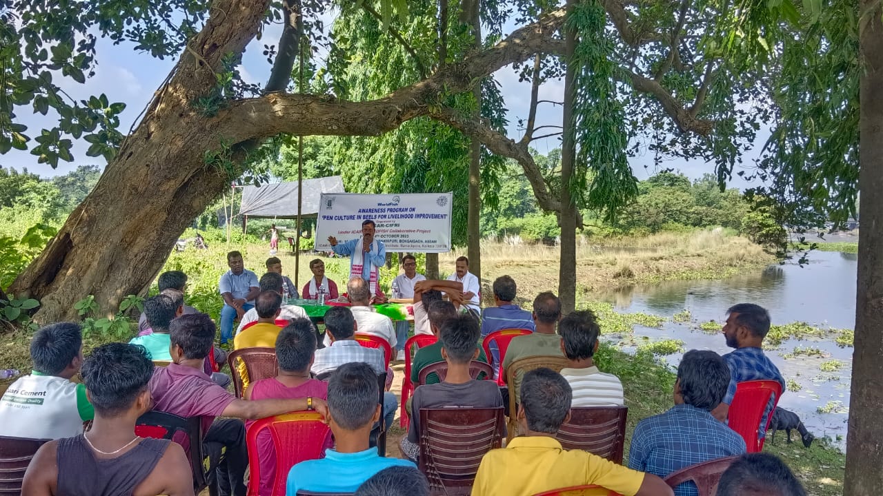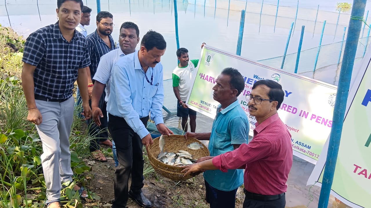 On the occasion of successful harvest of fishes reared in pens, a Field Day on “Harvest of fishes reared in Pens” and an awareness program on 'Pen culture in beels for livelihood' was organized on 14.10.2025 at Tamranga beel. The programme was organized under the overall guidance of Dr. B. K. Das, Director, ICAR-CIFRI, Barrackpore; Dr. S. K. Majhi, Head and Dr. B. K. Bhattacharjya, Principal Scientist, ICAR-CIFRI RC, Guwahati. It was coordinated by Dr. Pronob Das, Senior Scientist; Dr. S. Borah, Scientist and Mr. M. Hoque, YP-II, ICAR-CIFRI RC, Guwahati. Shri Harun Rashid Mondal, Sub-Divisional Fishery Officer, Abhyapuri, Bongaigaon district, Govt. of Assam graced the Programme. Mr. P. Kalita, Fishery Development Officer of the district also joined the programme. The programme was attended by 60 people including beel lessee, fish farmers, officials, and Scientists.