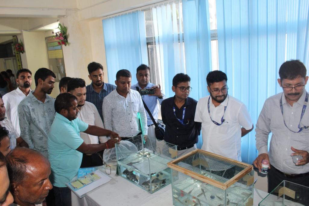 Inaugurating the event, Dr. B. K. Das, Director, ICAR-CIFRI, highlighted the Institute’s farmer-friendly innovations and the use of the organic product ‘CIFRI Fish Tanavhari’ to reduce fish mortality and stress during transport. He also mentioned that the workshop is a follow-up action to queries the raised by the farmers during the Governor conclave held in Assam during earlier this year. Dr. P. C. Bhuyan, Dean College of Fisheries, AAU, Raha appreciated the effort of team ICAR-CIFRI for developing such useful product for benefit of the fish farmers. Dr. R. C. Barman, Joint Director, Department of Fisheries, Govt. of Assam mentioned that the product will able to address the problem face by the aquaculture sector of the state for live fish and seed transportation. He also urge for more such programme in different parts of the state. Dr. Kanchan Saikia, In-charge, IARI-Assam, Gerua Centre, Guwahati addressed the gathering and showed interest for collaboration with ICAR-CIFRI for such noble research and development programme. Mr. A. K. Bora, In-charge, NFDB Regional Centre, Guwahati assured for NFDB support to the farmers and entrepreneurs for different activities of aquaculture in the state.
