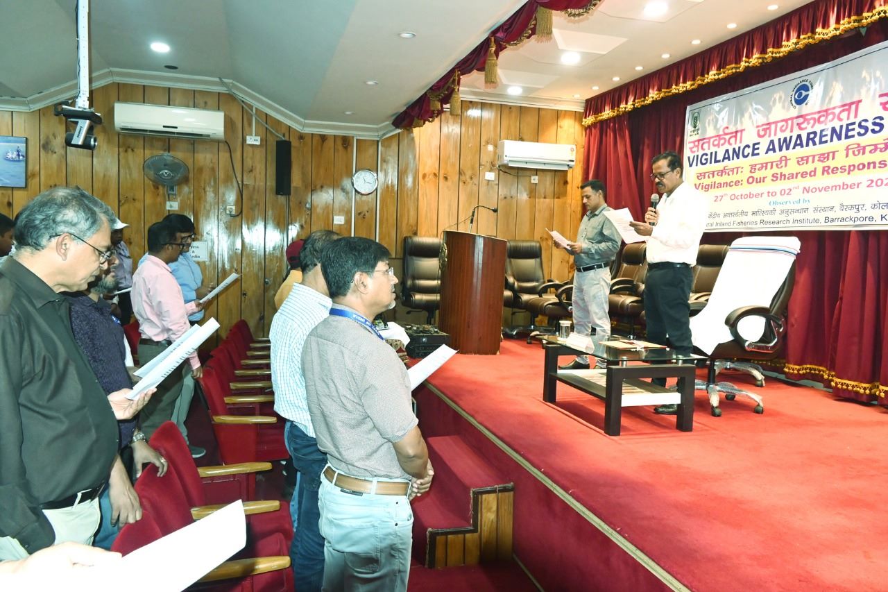 The event began with Dr. D.K. Meena, Senior Scientist and Vigilance Officer, introducing the significance and outlining the planned activities for the week. Dr. Meena invited Dr. B.K. Das, Director of the Institute, to administer the Integrity Pledge and encouraged all staff members to participate. The pledge ceremony saw engagement from 144 staff members, including contractual staff and research scholars, with several also completing the e-pledge. Throughout the campus, banners, posters, and placards highlighted the importance of vigilance, transparency, and integrity, reflecting CIFRI's commitment to maintaining high ethical standards in research and administration