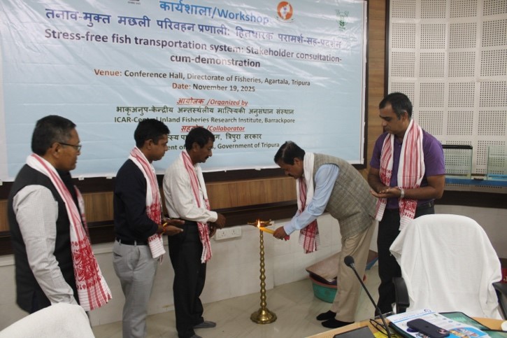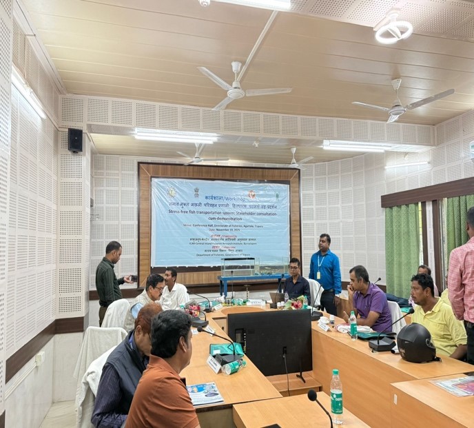 ICAR–Central Inland Fisheries Research Institute (ICAR-CIFRI), Barrackpore in collaboration with the Department of Fisheries, Govt. of Tripura organized a-day-long workshop on “Stress-free fish transportation system: Stakeholder consultation-cum-demonstration” in the conference hall, Directorate of Fisheries, P. N. Complex, Agartala on November 19, 2025. The main objective of the workshop was to sensitized eco-friendly technologies developed by ICAR-CIFRI for safe and hassle-free fish transportation for livelihood improvement among the stakeholders.