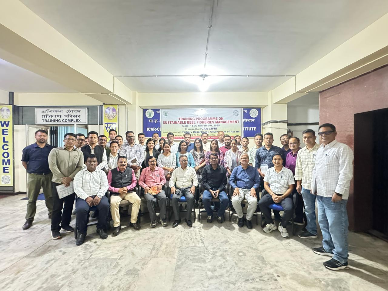 During the 3-days training programme, emphasis was given on sound and holistic management of beel fisheries. Important topics like management protocols for beel fisheries, macrophyte control, fish disease management, environment monitoring, fish seed rearing, community based fisheries management, engineering aspects, fish in human nutrition were covered. The valedictory session of the training programme was held on 20th November, 2025. In the valedictory session Dr. Simanku Borah, Scientist and Coordinator of the training program presented a brief training report. Shri Gauri Sankar Das, ACS, Director of Fisheries, Assam was the chief guest in the valedictory session. He emphasized that there is scope for tremendous development in fisheries sector of the state and particularly in beel fisheries and all the officials should work cohesively and whole-heartedly. Fisheries officials of the state expressed their satisfaction on the training program.