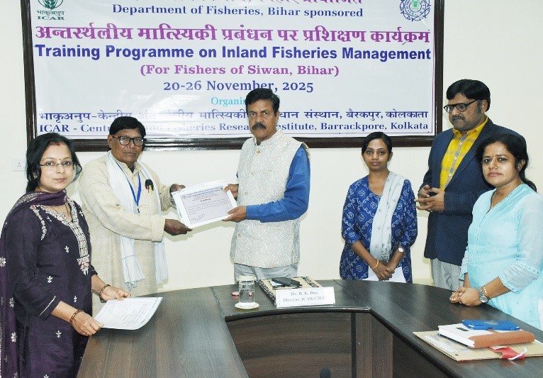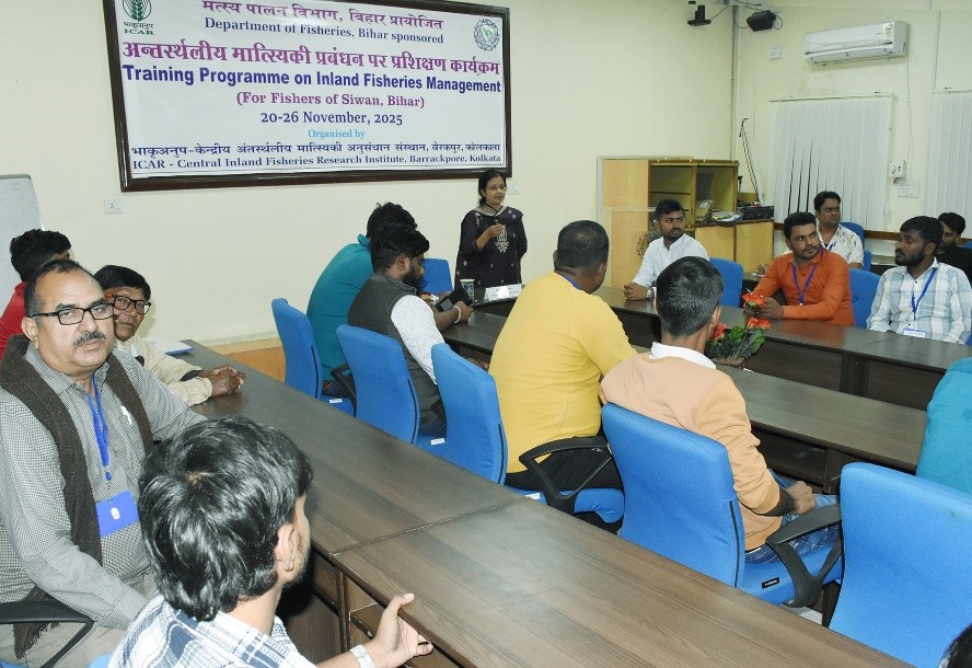 A seven-day training programme on “Inland Fisheries Management” was successfully conducted for 30 fish farmers from Siwan, Bihar, from January 20 to November 26, 2025, under the sponsorship of the State Fisheries Department. The programme was organised under the overall guidance of Dr. B. K. Das, Director, ICAR–Central Inland Fisheries Research Institute (ICAR-CIFRI), with the objective of strengthening the knowledge and skills of rural fish farmers and equipping them with best practices for sustainable and profitable fisheries management.