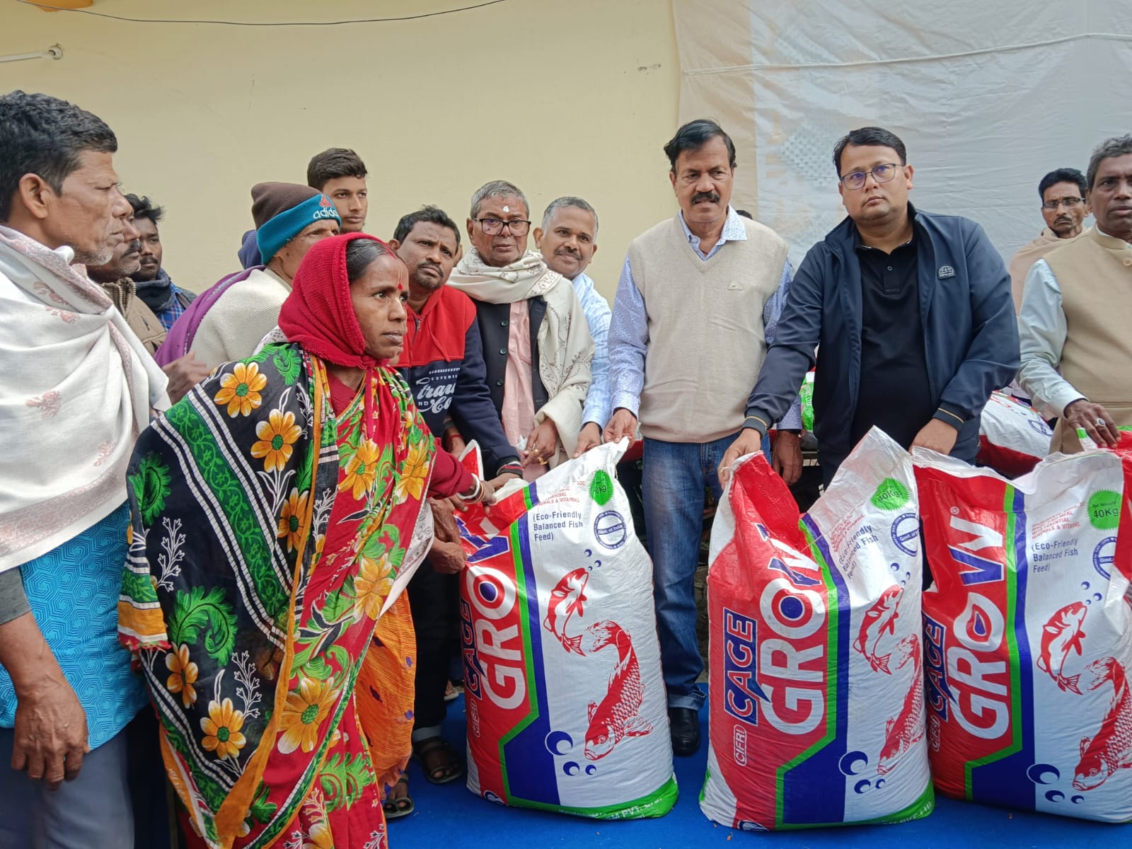 Under the programme, 300 SC fish farmers. from different Gram Panchayats of the Sagar Community Development Block. were benefited. Each beneficiary received 6 kg of Indian Major Carp (IMC) fingerlings and 80 kg of fish feed. for backyard pond fish culture demonstrations. The initiative targets households owning small ponds ranging from 0.02 to 0.04 hectares, enabling supplementary income generation and improved family nutrition without affecting household responsibilities.