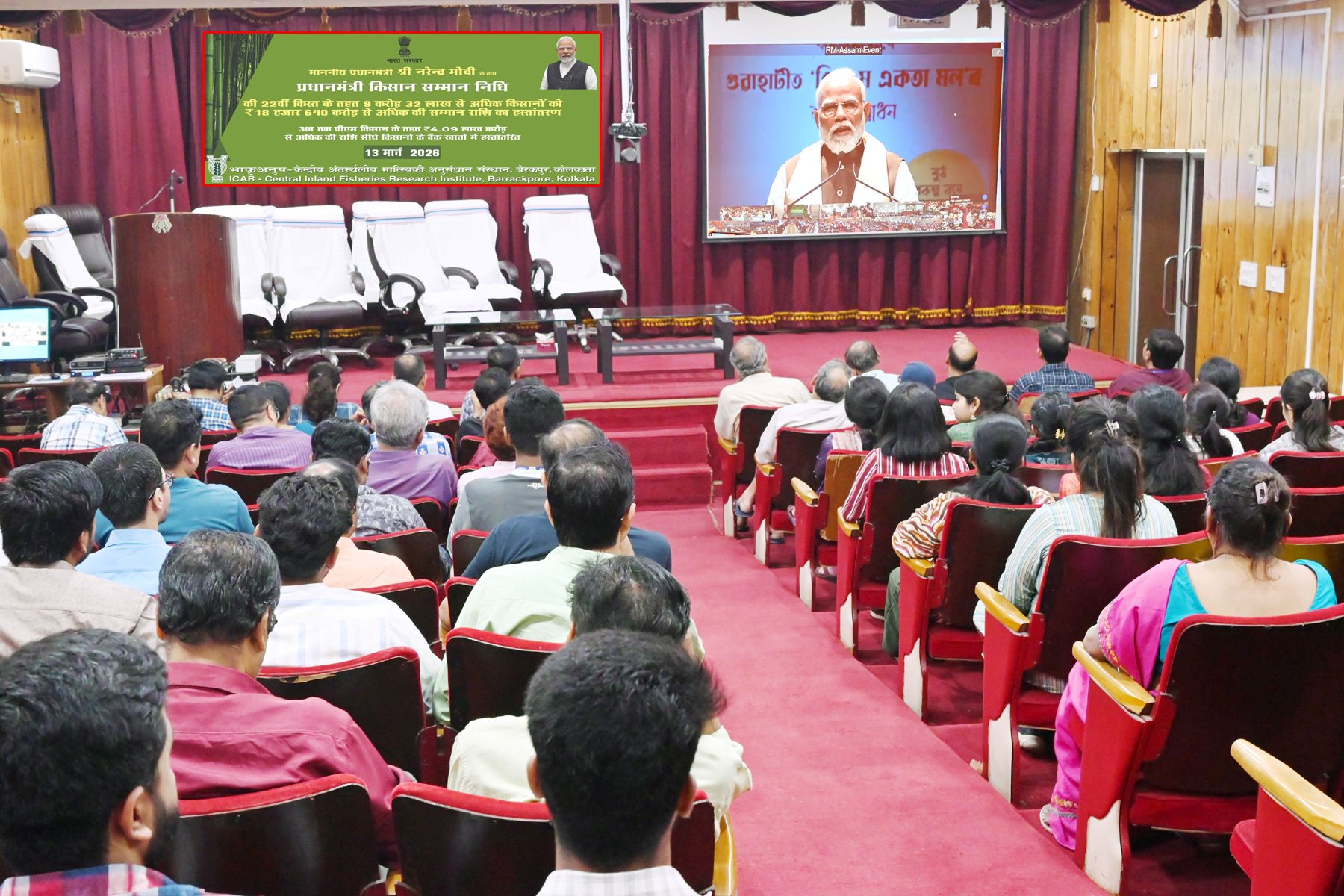 The live telecast of the release of the 22nd instalment of the Pradhan Mantri Kisan Samman Nidhi (PM-KISAN) Scheme by Hon’ble Prime Minister Shri Narendra Modi was viewed on Friday, 13 March 2026, at 5:00 PM onwards at ICAR-CIFRI. The event was organized to enable fish farmers to witness this important initiative aimed at supporting the agricultural community of the nation.