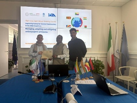 and Dr. Suman Kumari (Senior Scientist)-participated in the High-Level Specialized Training Course on “Improving Safety for Coastal Communities in the IORA Countries” held in Italy from 12 to 19 April 2026. The program was conducted at the Tricase Center (Center for Fisheries and Aquaculture), Lecce (Italy), of the International Center for Advanced Mediterranean Agronomic Studies (CIHEAM), Valencia (Bari, Italy). The objective of the high-level specialized training course was to strengthen the technical and institutional capacities of the representatives from 14 IORA (Indian Ocean Rim Association) member states to improve the sustainable management of coastal communities and ensure safety in the region in the face of climate change and some detrimental anthropogenic pressures on coastal areas. This is a program of IORA within the framework of the IORA-Italy Dialogue partnership and partially sponsored by the government of Italy. The nominations from the institute, selected through an internal process based on work experiences, were forwarded to the organizers through the Ministry of External Affairs, Government of India. Representatives from the Ministry of Fisheries, Animal Husbandry & Dairying, the Ministry of Earth Sciences, Government of India, and various other countries also attended the program. The program facilitated deliberations on critical issues such as coastal safety, disaster preparedness, climate resilience, and sustainable livelihoods. Key sessions focused on early warning systems, risk assessment, nature-based solutions, community-based adaptation strategies, and science-policy integration.