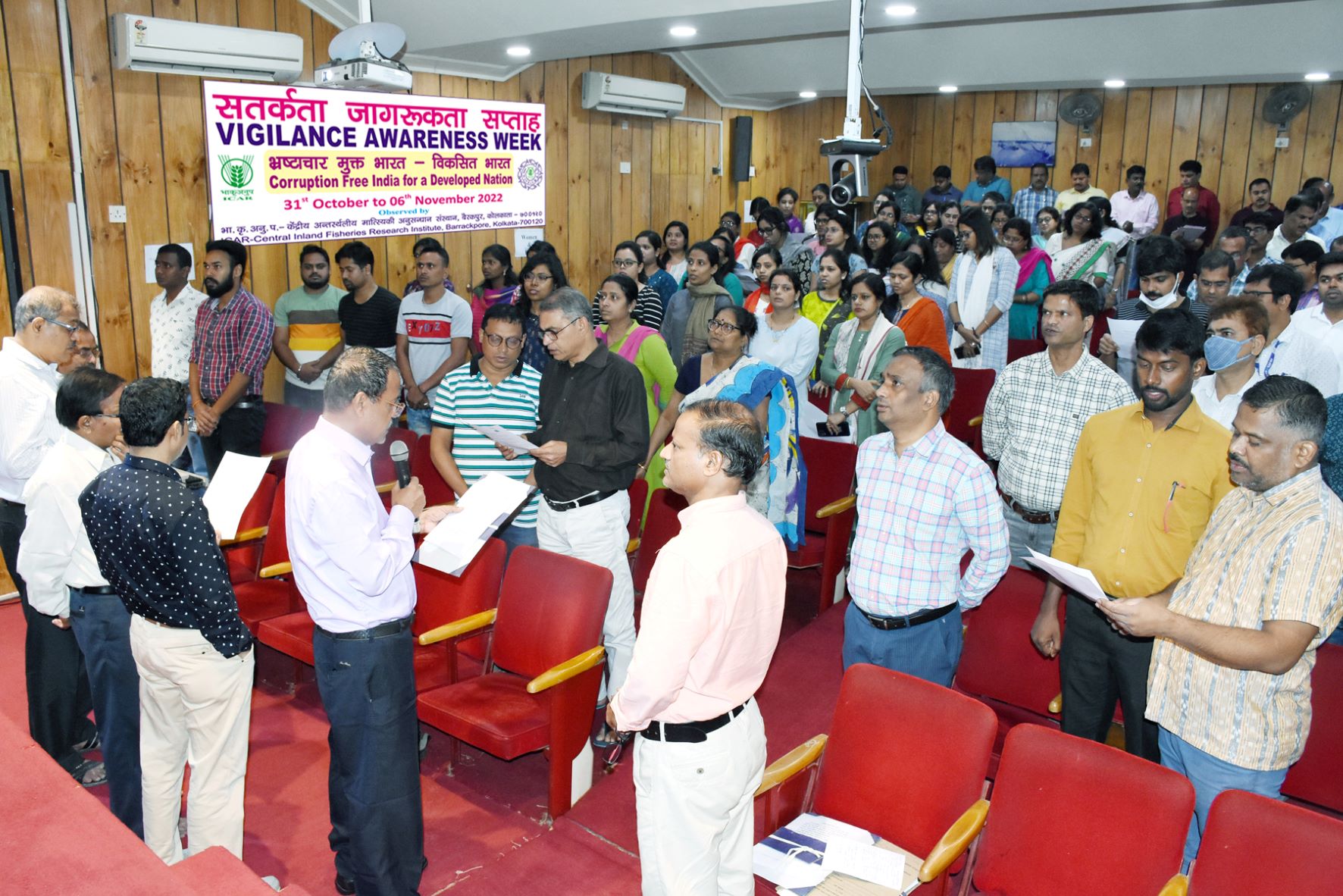 The week long observance was started with administration of pledge to the officials and staff on 31st October by the Director. Many of the staff also took e-pledge. Large numbers of posters, banners, placards were displayed at the campus premises showing the ill effects of corruption and the commitment of CIFRI toward zero tolerance on corruption. On the next day all the staff formed a human chain showing the solidarity and unity in fighting the corruption. The human chain was followed by a walkathon upto local ferry ghat, a busy commuting point, in order to make aware and sensitize the general public for raising their voice against cheating/corruption. The walkathon arouse much interest of the locals and commuters.