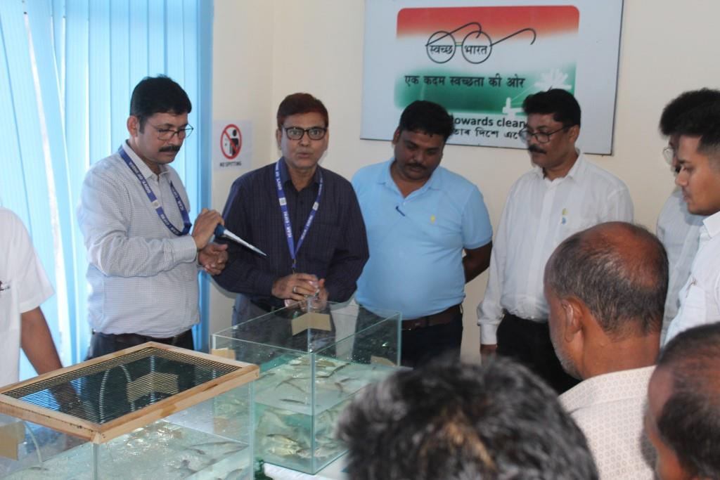 Inaugurating the event, Dr. B. K. Das, Director, ICAR-CIFRI, highlighted the Institute’s farmer-friendly innovations and the use of the organic product ‘CIFRI Fish Tanavhari’ to reduce fish mortality and stress during transport. He also mentioned that the workshop is a follow-up action to queries the raised by the farmers during the Governor conclave held in Assam during earlier this year. Dr. P. C. Bhuyan, Dean College of Fisheries, AAU, Raha appreciated the effort of team ICAR-CIFRI for developing such useful product for benefit of the fish farmers. Dr. R. C. Barman, Joint Director, Department of Fisheries, Govt. of Assam mentioned that the product will able to address the problem face by the aquaculture sector of the state for live fish and seed transportation. He also urge for more such programme in different parts of the state. Dr. Kanchan Saikia, In-charge, IARI-Assam, Gerua Centre, Guwahati addressed the gathering and showed interest for collaboration with ICAR-CIFRI for such noble research and development programme. Mr. A. K. Bora, In-charge, NFDB Regional Centre, Guwahati assured for NFDB support to the farmers and entrepreneurs for different activities of aquaculture in the state.