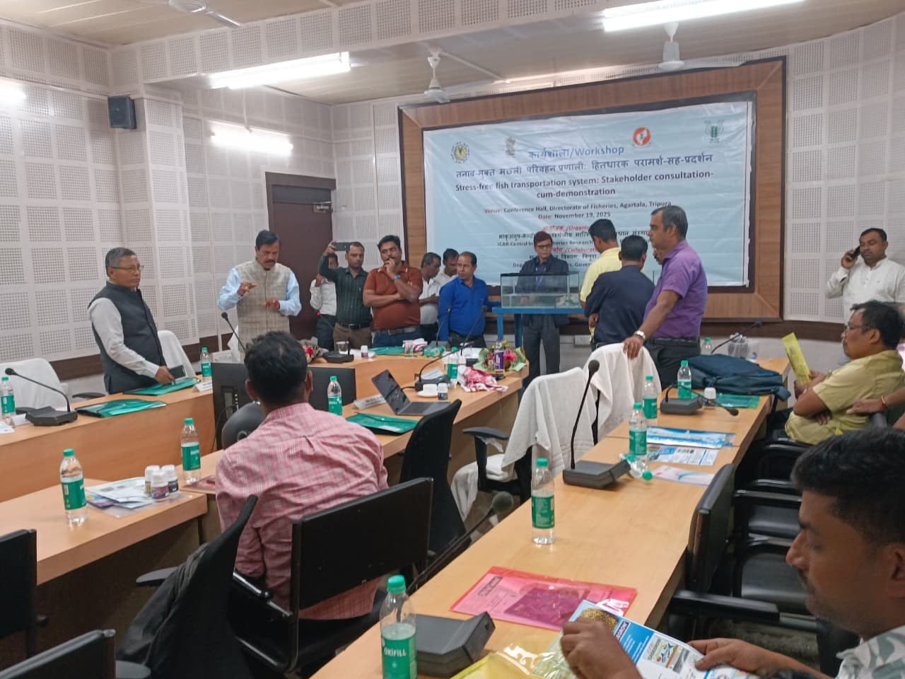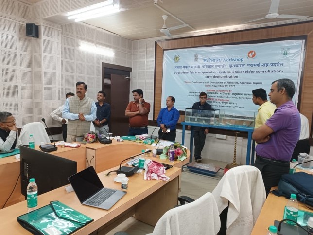 ICAR–Central Inland Fisheries Research Institute (ICAR-CIFRI), Barrackpore in collaboration with the Department of Fisheries, Govt. of Tripura organized a-day-long workshop on “Stress-free fish transportation system: Stakeholder consultation-cum-demonstration” in the conference hall, Directorate of Fisheries, P. N. Complex, Agartala on November 19, 2025. The main objective of the workshop was to sensitized eco-friendly technologies developed by ICAR-CIFRI for safe and hassle-free fish transportation for livelihood improvement among the stakeholders.