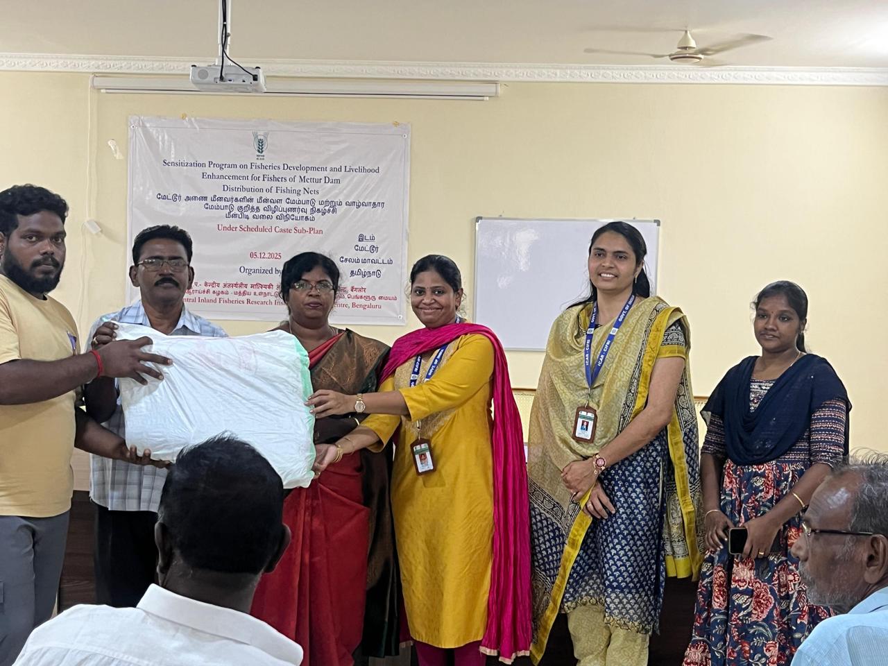 As part of the program, fishing nets were distributed to fifteen Scheduled Caste (SC) fishers, including three women beneficiaries. The program was attended by 50 fishers of Mettur Dam, Salem district. Dr. V. L. Ramya, Senior Scientist welcomed the gathering and highlighted the contributions of ICAR-CIFRI towards the enhancement and sustainable management of inland fisheries. Dr. Sibina Mol S., Scientist, spoke on the importance of responsible fisheries and conservation of fishery resources. Smt. Umakalaiselvi, Assistant Director, Department of Fisheries, Salem, Tamil Nadu outlined the various schemes available for fishermen.